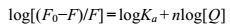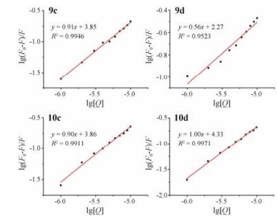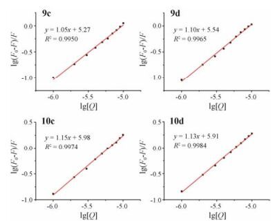 Figure 4 The linear fitting plots of log[(F0-F)/F] versus log[Q] of 9c, 9d, 10c, 10d that titrated with HTG21 |