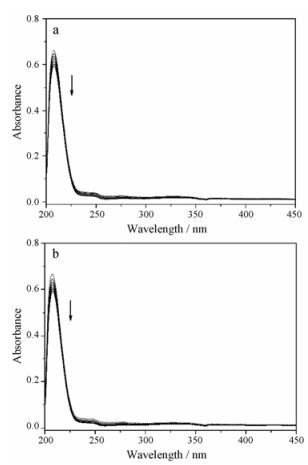 Figure 6 Electronic absorption spectra of 10c (a) and 10d (b) that titrated with HTG21 |