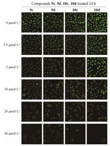 采用AO/EB双染法对化合物(9c、9d、10c、10d)进行测试。如图 7所示, 随化合物浓度增大, 逐渐发生了核固缩、核破裂、过度膨胀和细胞变形等明显的细胞形态变化。这些现象说明这些化合物可以有效抑制细胞增殖。当10c和10d的浓度达到40 μmol·L-1时, 几乎已观察不到活细胞。