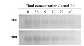 采用PCR stop实验以研究化合物10c和10d对端粒酶的抑制作用。银染的照片显示于图 8中。随化合物浓度增加, 条带颜色明显变淡, 这说明化合物在稳定了G-四联体结构后, 能有效抑制端粒酶的扩增能力。