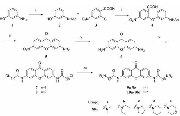 天然吨酮衍生物主要存在于植物与真菌类中, 其优异的抗癌活性激励了很多研究者以不同的取代基对母核进行合成修饰[9]。本实验室之前的研究表明二取代吨酮具有很好的G-四联体结合能力[10]。在本课题的研究中, 继续选用吨酮母核作为具有芳香性的近平面结构的药效团, 并在其3, 6位以可质子化的末端氨基侧链修饰以增强与靶点的亲和力。运用分子对接来辅助该系列化合物的合理化设计[11]。对接结果显示该系列化合物的母核部分能够与四分体表面产生π-π堆积作用, 而末端氨基能够与HTG21的磷酸骨架产生静电作用。这一假设与荧光发射和紫外吸收实验相一致, 并且结合常数与猝灭常数的大小次序间存在着一定关联。化合物10c和10d被确定为该系列最强效的G-四联体结合剂, 并具有高选择性。随后的MTT、AO/EB染色和PCR stop实验表明这些化合物具有良好的生物效应, 特别是10c和10d的MTT IC50值低于对照品顺铂, 具有作为强效的抗癌先导物进一步开发的潜力。目标化合物的合成如合成路线1所示。