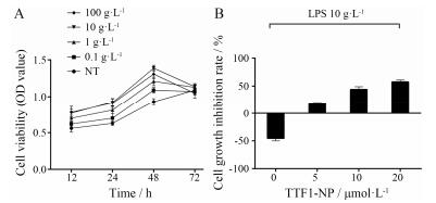 MTT比色法检测细胞增殖 对数生长期的人肝癌HepG2细胞, 取适量胰酶进行消化, 制成细胞悬液, 以细胞数1×104个/孔接种于96孔板中, 每孔细胞悬液200 µL。待细胞贴壁后, 弃去原孔内的培养液, 分别加入不同剂量的LPS或TTF1-NP分别培养12、24、48和72 h, 每孔内分别加入MTT溶液(5 g∙L-1) 20 μL, 继续培养4 h, 弃去孔内溶液, 每孔内加入二甲基亚砜(DMSO) 180 μL, 避光移至酶标仪内, 充分震荡10 min后, 测定490 nm处各孔内吸光度OD值, 计算细胞生长抑制率, 细胞生长抑制率(%) = (1 -OD样本 / OD阴性对照组) × 100%。