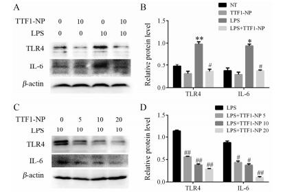 2 TTF1-NP对人肝癌HepG2细胞炎性因子的表达作用Western blot检测发现, TTF1-NP对HepG2细胞炎性受体蛋白TLR4和炎症因子IL-6表达有抑制作用(图 2A), 但与NT组比较差异不显著; TTF1-NP对LPS刺激后TLR4和IL-6表达有显著抑制作用(图 2A), 与LPS组比较有统计学意义(图 2B); TTF1-NP明显抑制LPS刺激后HepG2炎性受体蛋白TLR4和炎症因子IL-6表达(图 2C), 表现为剂量依赖性。与LPS组比较, 差异显著, 有统计学意义(P < 0.05或P < 0.01) (图 2D)。