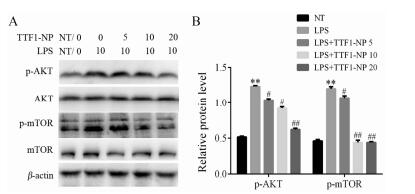 Figure 3 Effects of TTF1-NP on LPS induced key protein levels of AKT/mTOR pathway in HepG2 cells. HepG2 cells were pretreated with LPS (10 g∙L-1) and then treated with various concentrations (5, 10 and 20 μmol·L-1) of TTF1-NP for 48 h. A: Western blot; B: Quantification analysis. n = 3, x±s. **P < 0.01 vs NT; #P < 0.05, ##P < 0.01 vs LPS |