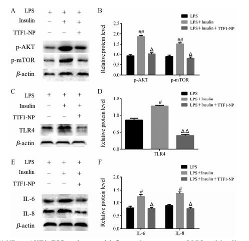 4 TTF1-NP对insulin刺激后AKT/mTOR通路蛋白及炎性反应的作用情况Western blot检测发现, TTF1-NP显著抑制了insulin活化的p-AKT和p-mTOR蛋白表达(图 4A), 与insulin组比较, 具有显著性差异(P < 0.05) (图 4B); Insulin对炎性受体蛋白TLR4表达也有促进作用, TTF1-NP抑制以上作用(图 4C), 与insulin组比较, 具有显著性差异(P < 0.01) (图 4D); TTF1-NP能够显著抑制insulin引起的炎症因子IL-6和IL-8的表达(图 4E), 与insulin组比较, 具有显著性差异(P < 0.05) (图 4F)。