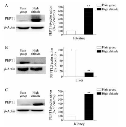 Figure 2 Protein expression of PEPT1 in rat intestine (A), liver (B) and kidney (C) after acute hypoxia at high altitude. n = 6, x± s. **P < 0.01 vs plain group |