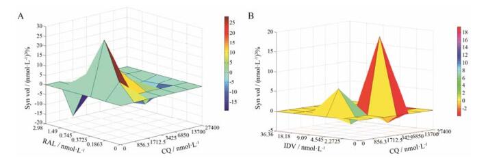 2.2 氯喹联合用药的抗HIV-1KM018作用氯喹与整合酶抑制剂RAL联合抗临床分离株HIV-1KM018实验的协同/拮抗容积量为63.46 ± 15.93/-44.83 ± 12.7 [(nmol·L-1)2%], 表现出中度协同作用。1.7125 μmol·L-1氯喹与0.3725 nmol·L-1 RAL联合使用时协同作用最强; 氯喹与蛋白酶抑制剂IDV联合用药协同/拮抗容积量为27.01 ± 8.07/-7.33 ± 0.32 [(nmol·L-1)2%], 呈现轻度协同作用(图 3A)。3.425 μmol·L-1氯喹与2.2725 nmol·L-1 IDV联合使用时协同作用最强(图 3B)。