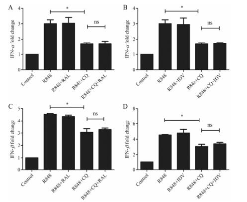 Figure 5 Inhibition of IFN-α upregulation by combinations of CQ+RAL (A), CQ+IDV (B); Inhibition of IFN-β upregulation by combinations CQ+RAL (C), CQ+IDV (D). *P < 0.05. ns: No statistical difference |