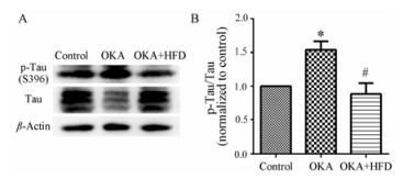 Figure 4 HFD reduced the high phosphorylation of Tau (S396). Western blot results of Tau protein, p-Tau (S396) and β-actin. n = 3, x±s. *P < 0.05 vs control; #P < 0.05 vs OKA |