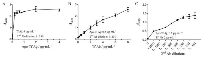 结果 1 ELISA间接法检测系统条件的确定为保证实验结果的有效性和可重复性, 首先需要确定最佳的apo-Tf抗原包被浓度、Tf抗体浓度和二抗稀释比例。在一定的Tf抗体浓度、二抗稀释比例的条件下, 随着apo-Tf抗原包被浓度的增加, A值明显增加, 在0.2~4 μg·mL-1内A值达坪台期(图 1A), 故采用A值基本达峰值的0.2 μg·mL-1作为本实验的apo-Tf抗原包被浓度。在一定的apo-Tf抗原包被浓度、二抗稀释比例的条件下, 随着Tf抗体浓度的增加, A值呈线性增加(图 1B), 由于Tf抗体浓度在4 μg·mL-1时所得A值在2.0左右, 处于酶标仪最佳响应范围, 故选择4 μg·mL-1为本检测体系的Tf抗体浓度。在一定apo-Tf抗原包被浓度、Tf抗体浓度的条件下, 随着HRP标记的羊抗鼠IgG二抗浓度的增加, A值逐渐增加, 当二抗稀释比例在1:250~1:150时, A值增加放缓, 几乎达到坪台期(图 1C), 故选择A值基本达峰值的1:250为本检测体系的二抗稀释比例。
