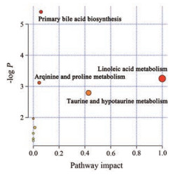采用Metabo Analyst对差异代谢物所涉及代谢通路进行富集分析。如图 7, 横坐标Pathway impact表示由拓扑分析所计算出的代谢通路重要性值, 纵坐标-log P表示代谢通路富集分析的显著性水平。本研究将impact value > 0.1以及-log P > 4的代谢通路视为贡献最大的代谢途径。主要包括: ①亚油酸代谢(linoleic acid metabolism); ②初级胆汁酸生物合成(primary bile acid biosynthesis); ③牛磺酸和亚牛磺酸代谢(taurine and hypotaurine metabolism); ④精氨酸和脯氨酸代谢(arqinine and proline metabolism)。