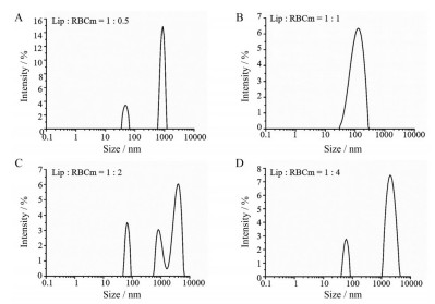 细胞膜囊泡与脂质体溶液投料比考察 考察共载脂质体与红细胞膜的最佳比例, 量取C+T/Lip溶液2 mL, 分别与1、2、4和8 mL红细胞膜囊泡溶液混合后, 探头超声处理3 min, 过0.45 μm微孔滤膜制备得到4个红细胞膜脂质体, 通过粒径仪测定每个制剂的粒径分布情况, 根据粒径分布图确定脂质体溶液与细胞膜囊泡的最佳体积比。