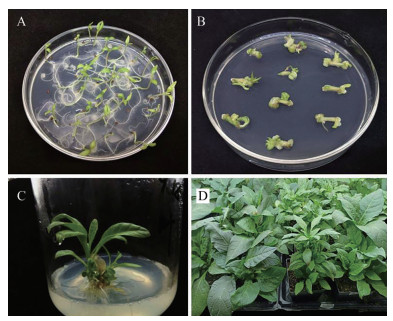Figure 3 Genetic ransformation flow chart of A. belladonna. A: Obtaining sterile belladonna seedlings through detoxification; B: Obtainment of kanamycin-resistant plants through selecting on medium with 100 mg·L-1 kanamycin; C: Propagation of transgenic A. belladonna plants; D: Transplantation of partial transgenic A. belladonna plants |