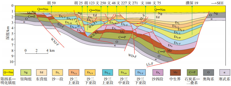 下载eps/tif图 图 1 东濮凹陷北区近东西向地震测线的地质剖面 Fig. 1 Tectonic interpretation of geological section in depth domain of east-west seismic line in northern Dongpu Sag