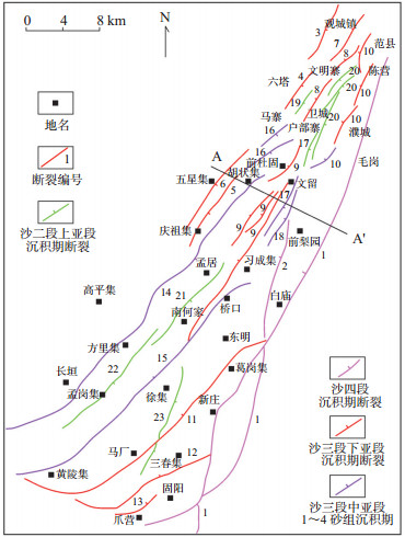 下载eps/tif图 图 2 东濮凹陷主要断裂系统 1.兰聊断层;2.杜寨断层;3.宋庙断层;4.六塔断层;5.石家集断层;6.五星集断层;7.观城断层;8.卫西断层;9.文西断层;10.濮城断层;11.马厂断层;12.三春集断层;13.爪营断层;14.长垣断层;15.黄河断层;16.马寨断层;17.文东断层;18.徐楼断层;19.文明寨断层;20.卫东断层;21.梁庄断层;22.方里集断层;23.马东断层 Fig. 2 Main fault system in Dongpu Sag