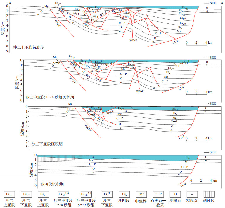 下载eps/tif图 图 3 东濮凹陷过测线A—A'剖面的四期断裂构造演化图(测线位置见图 2 WXJ-F.五星集断层;CY-F.长垣断层;SJJ-F.石家集断层;WX-F.文西断层;WD-F.文东断层;LL-F.兰聊断层;XL-F.徐楼断层 Fig. 3 Tectonic evolution of four stages of faults in section of survey line A-A' in Dongpu Sag