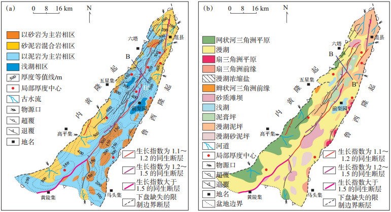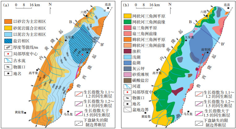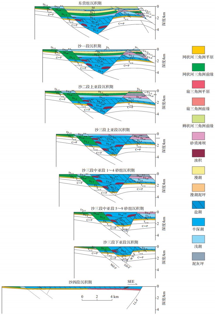 沙二段沉积期之后,早期产生的二、三级断层活动性逐渐减弱或消失,大量三、四级断层产生。沙一段沉积期,浅湖亚相沉积大面积发育,在户部寨、胡状集地区可见深湖亚相沉积,兰聊断裂带发育辫状河三角洲沉积,盆地西南部发育曲流河三角洲沉积。东营组沉积期,广泛发育曲流河三角洲平原沉积和三角洲前缘沉积,浅湖亚相沉积零星分布,兰聊断裂带局部发育扇三角洲平原亚相沉积。