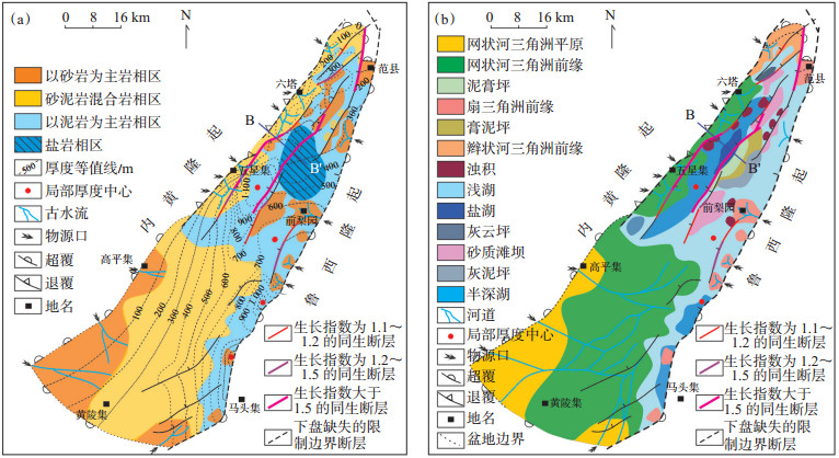 兰聊断层在前梨园及以东地区活动强烈,且泥岩岩相大量分布,同时长垣断层、黄河断层及文东、文西等二级断层更加活跃,湖盆的沉降速度大于沉积速度,这时物源的供给量已经小于可容纳空间量,三角洲开始退积,由于河流向湖盆的补给加大,气候变得湿润温暖,湖泊的含盐度有所降低,是沙三段沉积期湖盆最大扩张期。主物源来自于盆地西南部、东北部,砂泥混合岩相区的分布范围在东北部增大、在西南部减少,沉积-沉降中心基本一致,沉积-沉降中心主体仍位于柳屯—海通集洼陷,其次为葛岗集北洼陷。盆地西边界整体为退覆(图 6)。盆地在该时期发育浅湖—深湖、网状河三角洲、辫状河三角洲和扇三角洲等沉积体系。受长垣断层、黄河断层及文东断层的控制,古地形分异更加明显,滩坝砂、浊积砂分布范围更广。