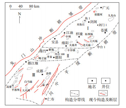 下载eps/tif图 图 1 川西地区现今构造分布简图 Ⅰ.川西北凹陷带;Ⅱ.绵竹低凸起区;Ⅲ.川西南凹陷带 Fig. 1 Present structural map in western Sichuan Basin |