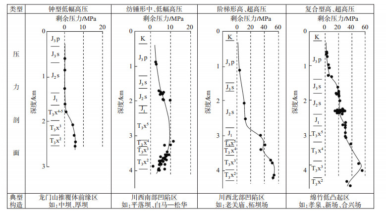 为了消除埋深的影响并直观表述超压的程度,本文使用剩余压力(p剩余= p实测- p静水)来反映地层超压。川西地区实测数据计算出的地层流体剩余压力数据显示,异常压力的发育层位和幅度在各区域均有所不同。按其垂向分布形态,可进一步划分为4种类型:钟形、纺锤形、阶梯形以及复合型。现以龙门山推覆体前缘区的中坝构造、川西南凹陷区的平落坝构造、川西北凹陷区的老关庙构造和绵竹低凸起区的新场构造为典型案例加以说明。