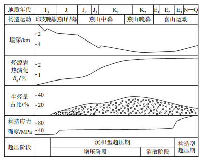通过利用PetroMod盆地模拟软件,恢复了川西地区埋藏热演化史,并计算了上三叠统烃源岩不同时期的生排烃量,结果显示川西地区上三叠统在晚白垩世之前长期处于沉降过程(图 3)。随着地层深埋加大,地温逐渐升高,生烃作用逐渐加强,该阶段的地应力也较小(≤ 40 MPa)。晚白垩世中、后期,地层开始抬升,生烃中止,在此之后地层未发生大规模的沉降,而地应力却在不断增强,并在古近纪末期超过了上覆负荷。因此,可将川西地区的压力发展阶段划分为沉积超压发展阶段(晚三叠世—始新世)和构造超压发展阶段(渐新世—现今)。其中,晚三叠世—早白垩世为沉积超压增压阶段,晚白垩世—始新世为沉积超压消散阶段。