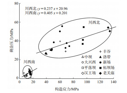 川西地区在喜山期的构造运动中遭受了强烈的构造挤压作用,夏新宇等[28]通过实验分析得出,上三叠统的水平应力梯度与地层压力梯度存在明显的对应关系。因此,可以推断该地区流体压力同构造挤压作用关系密切。将川西地区各构造现今的构造应力与流体剩余压力进行相关关系投点可以发现(图 4),二者存在一定的相关性,且川西北与川西南存在明显的地域差异,川西北地区位于高应力、高剩余压力区域,趋势线截距为21 MPa,即须家河组在前期的残留剩余压力约为21 MPa;川西南地区主要位于低应力、低剩余压力区域,趋势线截距通过原点。上述2条趋势线的斜率均小于1,表明地质系统未完全封闭,存在流体压力的泄漏现象。综上所述,构造挤压作用主导了川西北地区流体压力的变化,北部尚存约21 MPa的沉积型残余剩余压力,约占现今剩余压力的40%~70%,即构造挤压增压占比约为30%~60%。南部在构造挤压增压之前基本保持静水压力,后期构造挤压增压幅度也较小。