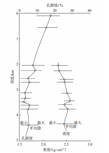 下载eps/tif图 图 5 川西地区实测孔隙度、岩石密度随深度变化曲线 Fig. 5 Variation curves of measured porosity and rock density with depth in western Sichuan Basin |