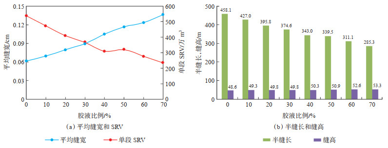 为了优化深层页岩气井滑溜水和胶液的比例,模拟胶液占比为0~70%情况下的裂缝形态,其结果(图 5)表明,随着胶液占比的增加,平均缝宽递增,但SRV减小。鉴于胶液成本约为滑溜水的3~ 4倍,综合优化单段施工液量中胶液占比为20%~ 30%。