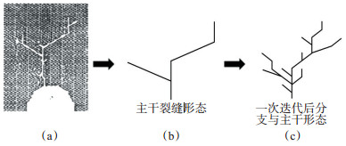 图 1中实验岩心周围的水平应力与垂直应力分别为20.8 MPa和11.3 MPa,垂向拉伸应力为27.4~41.8 MPa。观察裂缝形态抽提出其主干延伸规则[图 1(b)],将其主干形态作为生成规则代入分形几何生成系统,一次迭代后得到图 1(c)。若该裂缝为直井压裂后产生的单翼裂缝,则图 1(b)可等效为裂缝主干,而衍生后的图 1(c)则可等效为压裂后的主裂缝与次生裂缝形成的单簇裂缝或简单裂缝网络。