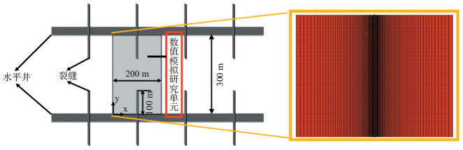 3.1 生成流程数值模拟模型包括2口平行的水平井,井距300 m,其中区域宽200 m,裂缝半长100 m(图 3)。垂直裂缝被假设为沿水平井均匀分布,同一口水平井相邻的裂缝间距约200 m,每条主裂缝半长为100 m。沿着X方向数值模拟研究单元左、右边界位于相邻主裂缝正中间处。由于裂缝分布的对称性,在不考虑流动边界条件的情况下,2条水平井即模拟区域的上下边界,由级数确定水平井的固定井底压力条件。