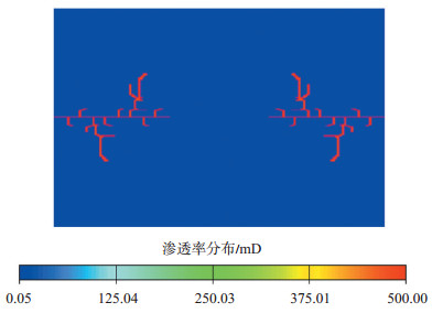 本次数值模拟通过E300模拟器CONDFRAC关键字来描述导流裂缝位置、裂缝开度(有效裂缝宽度)、裂缝渗透率、裂缝方向以及裂缝相对渗透率等参数。其中,导流裂缝位置与裂缝方向由随机分形缝网基本形态来决定,根据随机分形裂缝缝网的离散化节点坐标对数值模拟模型的网格进行等效化,本次数值模拟只考虑平面上裂缝形态产生的影响(图 5)。