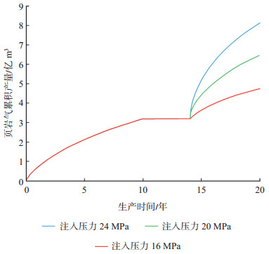 3.2.1 注入压力注入压力是影响吞吐效果的敏感参数,在定井底流压的情况下,注入压力越大,注入的CO2体积越大,气藏深部存在更多被置换出的页岩气。为研究不同注入压力对CO2埋存及页岩气产量的影响,本次研究模拟了在相同井底流压、注入时间和生产方式等条件下,以不同注气压力开发页岩气的生产过程。方案设计了3种注入压力:16 MPa,20 MPa和24 MPa等,后2种压力均小于地层的破裂压力,生产方式均为先生产10 a、注入4 a、再生产6 a,整个生产周期为20 a,页岩气累积产量如图 7所示。