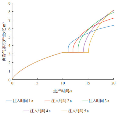 3.2.2 注入时间注入时间是影响吞吐效果的重要因素之一,注入时间直接影响注入的气体体积,进而影响到页岩气的累积产量和CO2的地质埋存。为研究不同注入时间对CO2埋存及页岩气产量的影响,本次研究模拟了在相同井底流压、注入压力、生产方式条件下,以不同注气时间开发页岩气的生产过程。实验设计了5种不同的注入时间:1 a,2 a,3 a,4 a,5 a。其中,注入压力选用24 MPa,均是生产10 a后注入。不同注入时间条件下得到的页岩气累积产量随时间的变化规律如图 8所示。