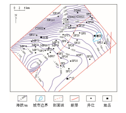 下载原图 图 1 川西什邡地区JP3 5砂组顶面构造特征 Fig. 1 Top structure characteristics of JP3 5 sand group in Shifang area of western Sichuan Basin |