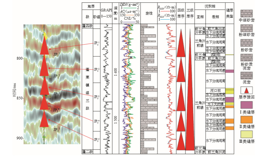 利用侏罗系蓬莱镇组在川西地区常用的3个标志层(仓山页岩、梨树湾页岩、景福院页岩), 自下而上将什邡地区蓬莱镇组气藏划分为蓬一段、蓬二段、蓬三段和蓬四段[9, 23], 其中, 蓬三段为本文研究的重点, 即以景福院页岩作为顶标志层, 梨树湾页岩之上的砂岩作为底界面。四川盆地蓬莱镇组总体为典型的湖盆沉积, 前人研究显示, 蓬三段与蓬四段可构成一个三级层序[9, 23]。研究区在地形上无明显的坡折, 缺乏低位域沉积, 蓬三段主要由湖平面逐渐上升的湖进体系域构成, 顶界面为快速湖进所形成的区域湖泛面, 即"景福院页岩", 岩性主要为深灰色泥页岩, 具有凝缩段的性质, 表现为高伽马和中、低电阻率的测井响应异常, 底界面主要为岩性转换面, 在三级层序湖进体系域格架内, 依据河道冲刷面、次级湖泛面等次级层序界面, 进一步将蓬三段划分成多个五级层序, 基本均由粒度向上变细的正旋回组成, 自上而下分别依次对应JP3 1, JP3 2, JP3 3, JP3 4, JP3 5等5个砂层组(图 2)。