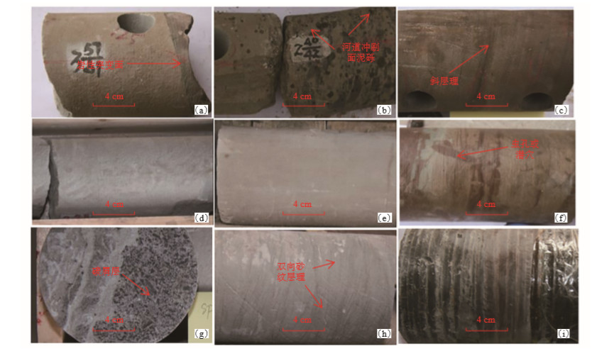 典型的岩石微相组合类型为:①河口坝砂岩+水下分流河道砂岩+水下天然堤粉砂岩型, 水下分流河道砂体累计厚度达6~8 m以上, 但单期河道砂体厚度常小于2 m, 河道多期叠置的特征明显, 主要发育块状层理; 水下分流河道之下发育逆粒序粉砂岩至砂岩沉积, 厚约0.5 m, 岩性渐变, 应为河口坝雏形; 水下分流河道之上发育沙纹层理(细)粉砂岩与薄层粉砂质泥岩互层沉积, 为水下天然堤的特征。②水下分流间湾粉砂质泥岩+远砂坝粉砂岩+前三角洲泥型, 水下分流间湾+远砂坝组合岩性主要为厚层泥岩夹薄层砂岩和粉砂岩, 岩性可在米级范围内出现泥岩-粉砂岩-砂岩-泥岩的变化, 呈渐变特征, 泥岩中虫孔及生物扰动丰富, 可见浅褐色泥岩中发育气胀构造, 自然伽马测井曲线呈低幅齿状, 可直接覆盖在水下天然堤或水下分流河道砂岩之上; 前三角洲岩性主要为深灰色泥岩, 代表了还原环境的较深水沉积[图 3(i)], 测井上具有高伽马、低电阻率的特征。据此, 识别出水下分流河道、水下分流间湾、水下天然堤、河口坝、远砂坝及前三角洲泥等6种微相, 建立相应的测井相识别模型, 并在沉积相序规律的约束下, 在单井上依次划分出多种微相, 水下分流河道和水下分流间湾是其中主要的2种沉积微相(参见图 2)。