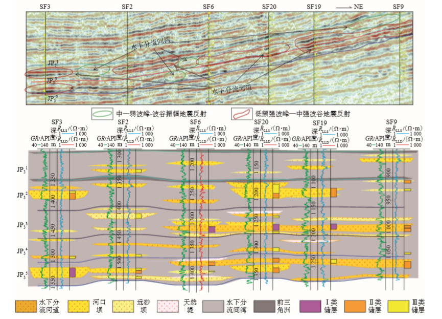 3.3 沉积相展布与沉积类型分析根据单井相分析结果详细标定地震剖面和地震相, 进行沉积微相剖面对比和平面展布研究[8, 13, 25-27], 通过完钻井的测井曲线与地震剖面的合成地震记录精细标定, 在蓬三段地层地震剖面上识别出以下2种主要沉积微相的地震相响应特征:①水下分流河道沉积, 呈低频强波峰-中强波谷中短轴状反射, 为水下分流河道强烈侵蚀下伏泥岩形成较强的波阻抗反射特征。②水下分流间湾沉积, 呈中-弱振幅连续、平行-亚平行反射地震相, 反映在一个沉积区域内相对稳定、沉积水动力能量中-低等的沉积相组合, 主要为低能沉积环境的泥岩、砂泥岩薄互层相[图 4(a)]。利用振幅属性的变化可描述砂体横向厚度变化, 最终完成连井剖面微相分析[图 4(b)]。