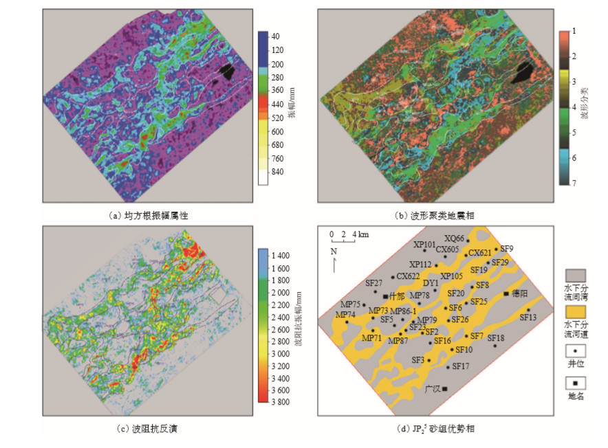 下载原图 图 5 什邡地区蓬三段JP3 5砂组地震属性及优势沉积相平面图 Fig. 5 Seismic attributes and sedimentary facies of JP3 5 sand group of Peng 3 member in Shifang area |