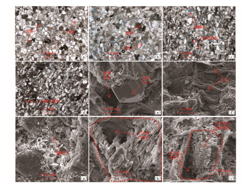 下载原图 图 6 什邡地区蓬三段JP3 5砂组储集岩岩性及孔隙类型 (a)细粒石英岩屑砂岩, SF20井, 1 324.3 m, 蓝色铸体; (b)细粒岩屑砂岩, 粒间(溶)孔发育, SF20井, 1 327.87 m, 蓝色铸体; (c)细粒石英岩屑砂岩, 发育粒间扩溶孔、铸模孔与粒内溶孔, SF3井, 1 531.4 m, 蓝色铸体; (d)粉细粒岩屑砂岩, 方解石胶结较为发育, 染色铸体薄片, SF3井, 1 531.4 m; (e)蒙脱石杂基、石英次生加大充填粒间孔, SF20井, 1 327.87 m, 扫描电镜; (f)云母定向排列, SF3井, 1 530.2 m, 扫描电镜; (g)蒙脱石充填粒间孔, SF20井, 1 327.87 m, 扫描电镜; (h)碱性长石溶蚀, 并生成钠长石微晶和片状蒙脱石黏土矿物, SF20井, 1 327.87 m, 扫描电镜; (i)细粒岩屑砂岩, 发育钾长石粒内溶孔, SF3井, 1 530.2 m, 扫描电镜 Fig. 6 Photos showing lithologies of reservoir rocks and pore type of JP3 5 sand group of Peng 3 member in Shifang area |