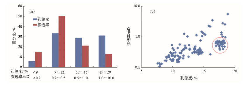 根据主要目的层JP3 5砂组储集层段岩心样品的常规物性分析结果, 孔隙度为7.6%~18.9%, 平均值为13.5%, 孔隙度大于15%的样品数占总储层样品数的31.3%[图 7(a)], 多数样品孔隙度为10%~ 15%, 占分析样品总数的60%左右, 参照碎屑岩储层孔隙度分类评价标准[34], 以25%, 15%, 10%为界, 划分为高孔隙度、中孔隙度、低孔隙度和特低孔隙度, 总体为中-低孔隙度储层。渗透率值为0.104~ 5.620 mD, 平均值为0.570 mD, 多数样品的渗透率小于1 mD, 可达分析样品总数的87%[图 7(a)], 参照碎屑岩储层渗透率分类评价标准[34], 以100 mD, 10 mD, 1 mD为界, 划分为高渗透率、中渗透率、低渗透率和特低渗透率, 主要为特低渗透率储层, 表明渗流能力较差。渗透率是影响气藏测试产能的关键因素之一, 也是影响储层质量评价的重要因素[35]。上述储层样品的孔隙度和渗透率的交会结果如图 7(b)所示, 少部分样品相关性较差(红色圈线), 与研究区砂岩岩性复杂, 发育粒内溶孔或铸模孔有关。