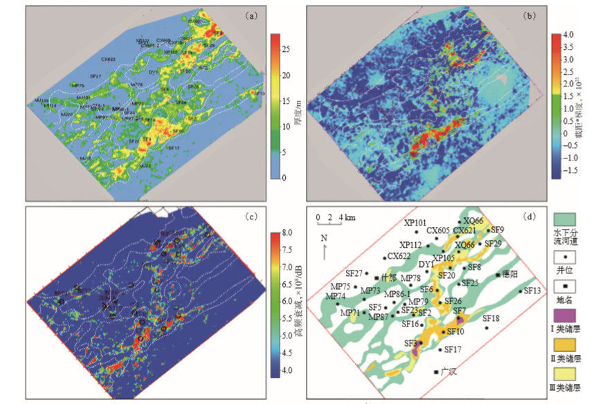 5.2 储层分布预测与评价什邡地区砂体沉积规模小、河道窄、岩性横侧向变化快, 由于砂体薄, 造成砂体的地震反射特征不清晰, 而储层的物性差异大、非均质性强等特征, 也加剧了储层分布规律复杂多样、预测难度大[6], 特别是含气性预测, 因为含气丰度10%和90%的砂体速度相差并不大, 叠后常规地震响应也大致相同[39]。因此, 本次储层及含气性地球物理预测, 在地质与地球物理充分标定、结合, 叠后地震属性综合分析的基础上, 进一步利用了叠前地震数据对含气性的综合响应进行分析, 开展地球物理预测, 并与叠后储层预测结果等互为验证。通过典型井的合成记录标定, 川西中浅层储层砂体的地震响应特征是低频、低波阻抗、强波峰、强波谷反射, 由此开展波阻抗岩性反演。通过砂泥岩的测井曲线自然伽马与波阻抗交会, 砂岩为低波阻抗、泥岩为高波阻抗, 确定2种岩性的波阻抗门槛值, 将波阻抗数据体转化为代表砂泥岩的数据体, 在各目的层时窗范围内, 把数据体累加起来再乘以采样率得到砂岩的时间厚度, 乘以目的层段的平均速度, 得到深度域的砂体厚度, 用钻井统计的砂体厚度对预测砂体厚度图进行校正, 得到砂体厚度[图 8(a)]。