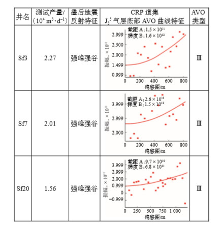 钻井测试结果显示, JP3 5砂组中部分物性好的砂岩储层产水, 即气藏气水分布复杂, 仅通过波阻抗难以对含气储层进行准确预测。因此, 利用叠前地震资料开展气层的AVO(反射波振幅随偏移距的变化)类型分析和叠前敏感属性分析, 进行含气性预测。什邡地区JP3 5砂组高产气层底界面的AVO曲线呈正截距、正梯度, 即近道弱、远道强, 振幅随偏移距的增加而增大的特征, 为比较典型的Ⅲ类AVO特征[40] (图 9)。什邡地区JP3 5砂层组截距属性平面图中, 北东-南西向条带为含气有利区, 含气饱和度较高[图 8(b)], 这一结果与叠后地震数据的高频衰减属性具有较好的一致性[图 8(c)], 与实际钻井测试结果吻合率高。