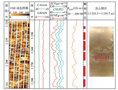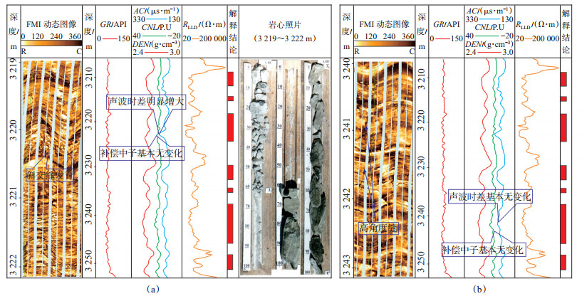 在电成像测井图上,张开裂缝表现为连续或间断的深色条带,其形状取决于裂缝的产状[16]。K油田B井KT-Ⅱ段中3 219~3 225 m段在电成像测井图上裂缝发育特征显著,岩心也因储层裂缝的发育而破碎严重[图 2(a)],3 218~3 223 m段的产出剖面解释产油量为32.5 m3/ d,占全井日产量的51.4%,反映了裂缝对储层渗流改造的关键作用。相对于孔隙型储层,裂缝-孔隙型储层的常规测井响应特征表现为储层段深侧向电阻率高背景值下的低深侧向电阻率,且具有一定的弱低岩性密度,当裂缝产状为低角度缝或斜交缝时,声波时差会明显增大,但当裂缝产状为直立缝或高角度缝时,声波时差基本无反应[图 2(b)],补偿中子基本不受裂缝的影响。