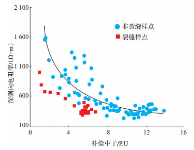 基于上述分析,可利用式(1)由补偿中子确定出一条基块岩石电阻率,进而在储层段中通过比较基块岩石电阻率和实测深侧向电阻率之间的大小确定出裂缝发育段,但因地层含油饱和度、沉积时期、岩性等因素的影响,深侧向电阻率和补偿中子的交会曲线是不断变化的(图 4),仅利用式(1)很难准确地确定出每一个层点的基块岩石电阻率。基于此,笔者提出利用补偿中子采用最小二乘法最优化连续求取基块岩石电阻率的方法。