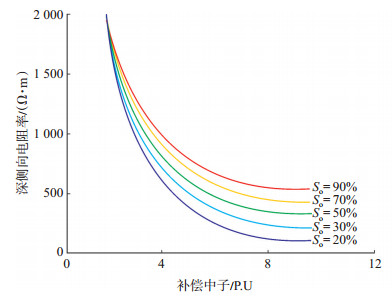 下载原图 图 4 K油田KT-Ⅱ段正演的随含油饱和度变化深侧向电阻率和补偿中子交会图 Fig. 4 Crossplot of deep lateral resistivity and compensated neutron with the change of oil saturation in forward modeling of KT-Ⅱ section in K oilfield |