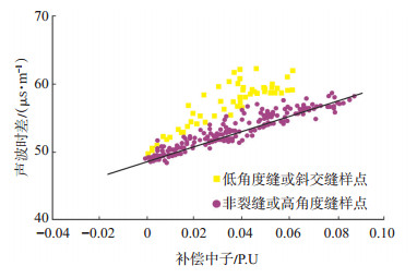 2.2 补偿中子和声波时差交会关系地层中发育低角度或斜交裂缝时,可导致声波时差增大或跳跃,但声波时差对高角度缝和直立缝的响应并不明显[18]。因此,笔者尝试利用补偿中子和声波时差的交会关系辅助上述储层段中裂缝识别的方法。在地层中随着孔隙度的增大,声波时差逐渐增大,补偿中子也随之增大,在不存在低角度缝和斜交缝的相同岩性的储层中,补偿中子NPHI和声波时差DT曲线的响应都只反映储层孔隙度的变化,两者的交会关系呈较好的正相关线性关系(图 5):