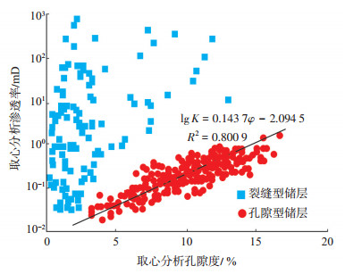 上述基岩孔隙的渗透率K解释模型的相关系数R为0.800 9,反映储层基岩孔隙的渗透率与孔隙度有较好的相关性。