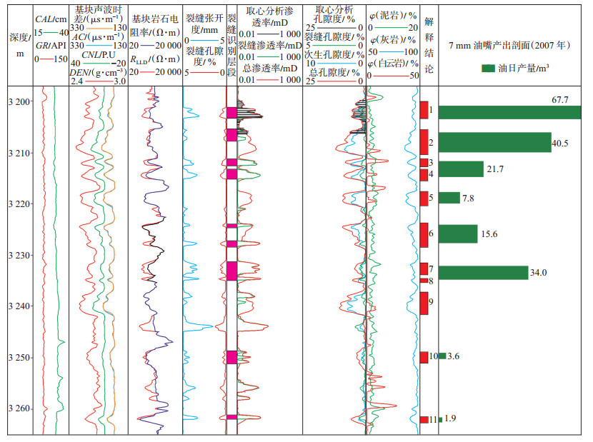 1号油层:测井解释的储层平均总孔隙度为6.1%,取心分析的孔隙度平均值为6.05%,利用本文提供的储层裂缝识别及处理方法研究表明,该段具有裂缝和孔隙共同发育的特征,且裂缝的角度以低角度缝或斜交缝为主,为典型的裂缝-孔隙型储层,解释的储层总孔隙度为6.1%,如果不考虑裂缝对储层渗透率的贡献,基岩孔隙的最大渗透率只有0.077 mD,这与取心分析的最大渗透率4.59 mD相差较大,通过储层裂缝参数的计算,储层的总渗透率最大值为4.38 mD,能够真实反映储层的渗透性能,2007年采用7 mm油嘴的产出剖面结果证实1号油层产油量为67.7 m3/d,为全井最大产量的产出层段。