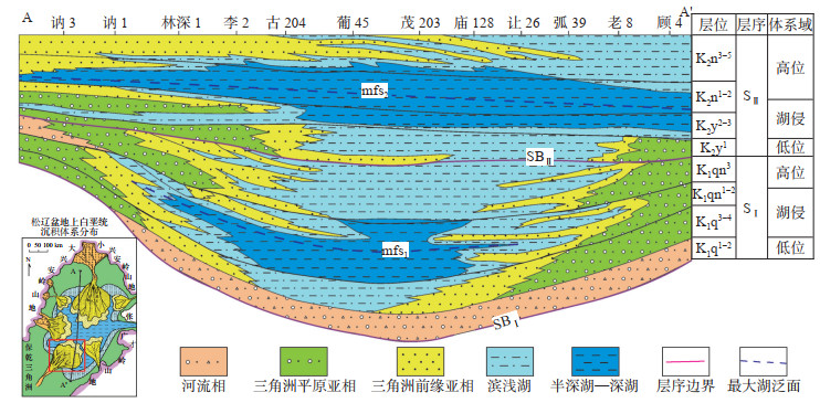 在泉头组、青山口组三段、姚家组、嫩江组三段沉积期,海平面较低,湖水通过出海口大量流出,湖泊明显变小、水体变浅,因此,大型浅水三角洲广泛发育,砂体可以沉积到湖盆中心。上白垩统泉头组—嫩江组是坳陷期沉积的主体,受盆地演化与湖平面升降控制发育2个完整的二级层序(图 1)[18-19]。下部层序由泉头组和青山口组组成,上部层序由姚家组和嫩江组组成,2次最大湖泛面分别在青山口组一段和嫩江组二段,形成了2套优质烃源岩。松辽盆地古湖泊水体大面积进退造成浅水三角洲纵向叠置,形成了典型的“三明治”结构,生油层、砂岩储层大面积指状交错,有利于在浅水三角洲前缘形成大面积油藏[20]。