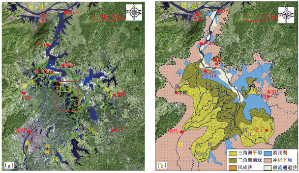 下载原图 图 2 鄱阳湖枯水期(2018年10月)遥感影像(a)及沉积相解析(b) Fig. 2 Remote sensing image(a)and sedimentary facies(b)of Poyang Lake in dry season |